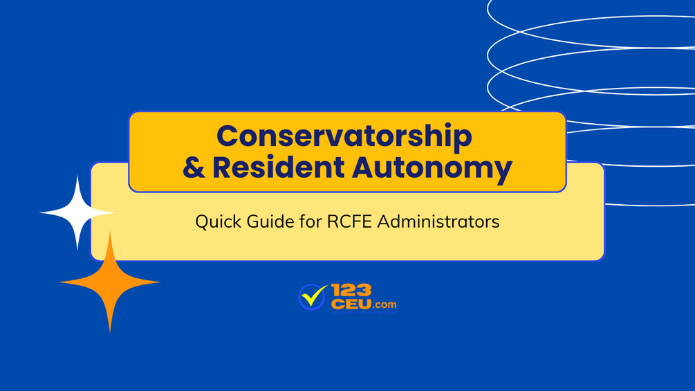 The "Conservatorship and Resident Autonomy" infographic, part of the Foundational Resident's Rights and Statutory Protections course, serves as a quick reference for RCFE administrators to navigate the complexities of conservatorships while promoting resident independence. It distinguishes between full and limited conservatorships, outlines administrators’ responsibilities, and emphasizes compliance with Title 22 regulations. Featuring tools like the Conservatorship Scope Checklist and Resident Autonomy Tracker, the infographic provides actionable steps for maintaining resident rights, dignity, and autonomy while ensuring proper documentation and communication with conservators.